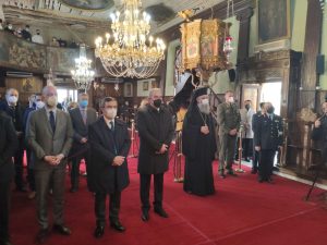 Ο κ. Οικονόμου παρέστη στη Θεία Λειτουργία που πραγματοποιήθηκε στον Ιερό Ναό Αγίου Χαραλάμπους και στη λιτάνευση της ιεράς εικόνας του πολιούχου που ακολούθησε.