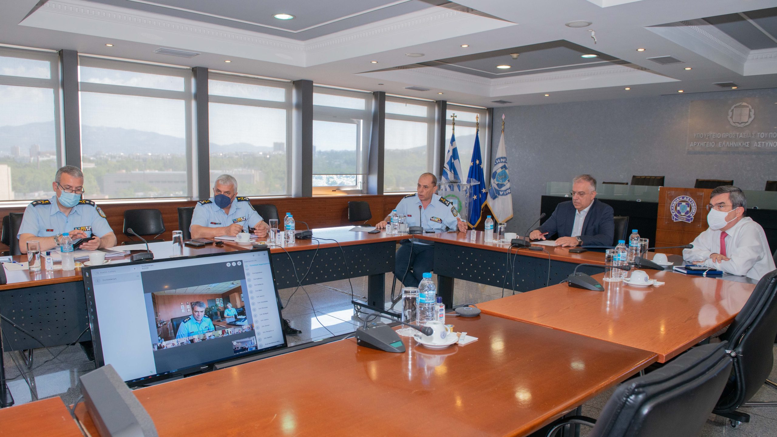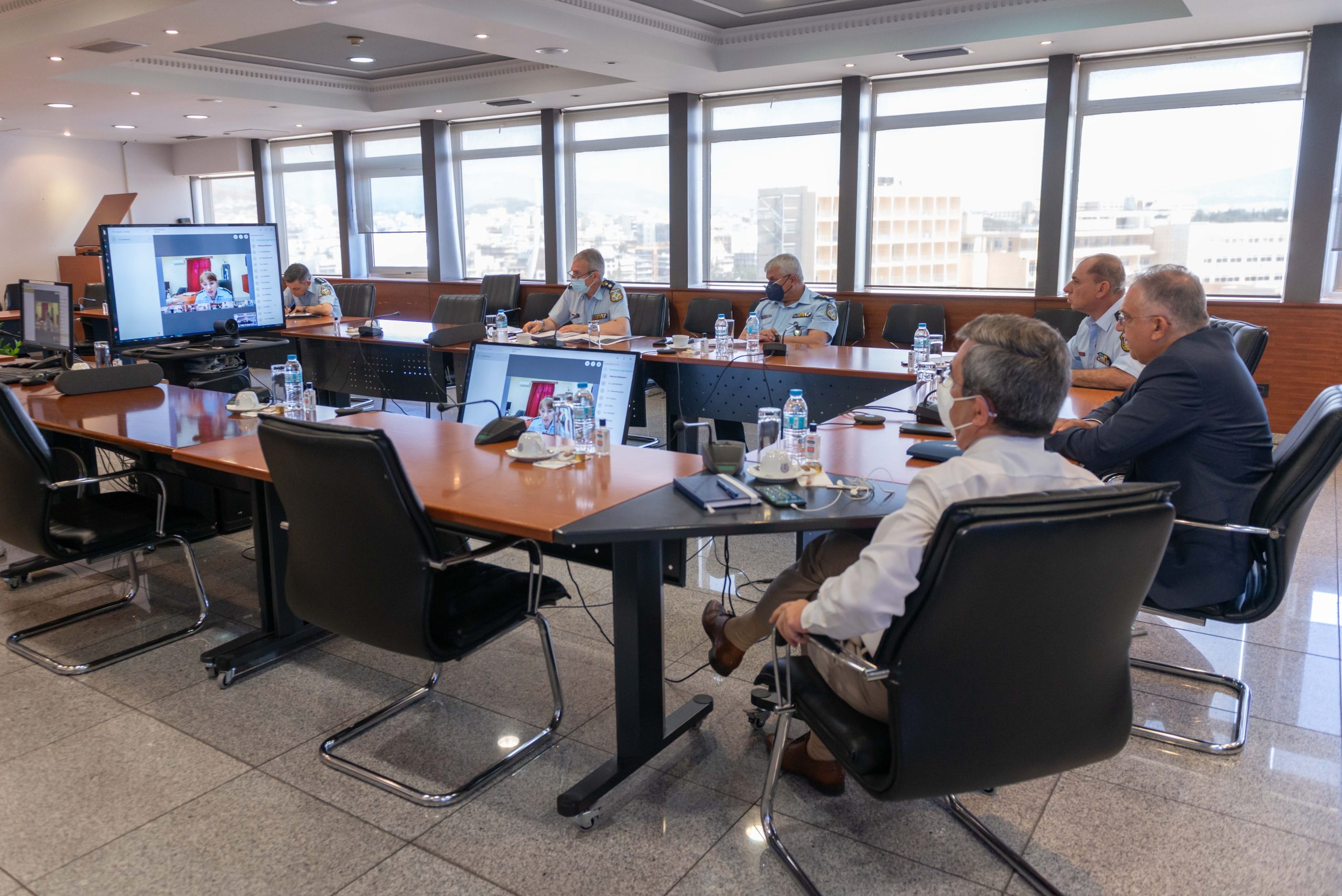 Ευρεία σύσκεψη μέσω τηλεδιάσκεψης υπό τον Υπουργό Προστασίας του Πολίτη Τάκη Θεοδωρικάκο πραγματοποιήθηκε σήμερα, με τη συμμετοχή του Υφυπουργού Λευτέρη Οικονόμου, του Αρχηγού της Ελληνικής Αστυνομίας, Αντιστράτηγου Κωνσταντίνου Σκούμα, του Γενικού Επιθεωρητή Αστυνομίας Νοτίου Ελλάδος, Αντιστράτηγου Γεώργιου Κανέλλου, του Προϊσταμένου Κλάδου Αλλοδαπών και Προστασίας Συνόρων του Αρχηγείου Ελληνικής Αστυνομίας, Υποστράτηγου Δημήτρη Μάλλιου και 21 Αστυνομικών Διευθυντών. Στην τηλεδιάσκεψη συζητήθηκε η αποτελεσματικότητα των μέτρων ασφαλείας στα αεροδρόμια και τις πύλες εισόδου της χώρας.