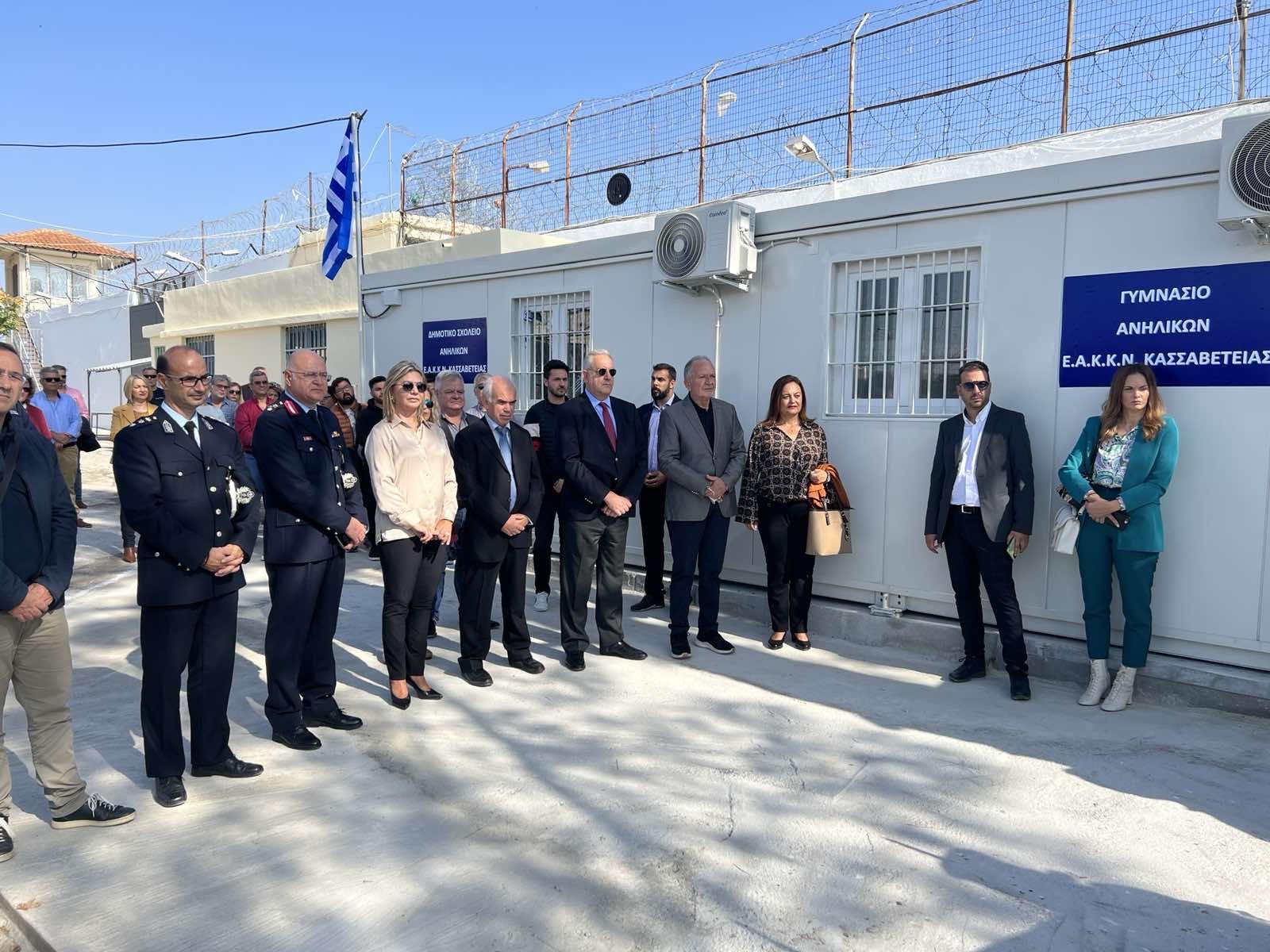 Στο Ειδικό Αγροτικό Κατάστημα Κράτησης Νέων Κασσαβέτειας, πού κρατούνται νεαροί από 15 έως 25 ετών, πραγματοποιήθηκε από τον Γενικό Γραμματέα η τελετή εγκαινίων για τις νέες σχολικές εγκαταστάσεις. Αγιασμό τέλεσε ο Μητροπολίτης Δημητριάδος και Αλμυρού Ιγνάτιος, ενώ παραβρέθηκαν ο Υφυπουργός παρά τω Πρωθυπουργώ κ. Χρήστος Τριαντόπουλος, η Υφυπουργός Παιδείας και Θρησκευμάτων, κα Ζέττα Μακρή, οι Βουλευτές κ.κ. Χρήστος Μπουκώρος και Αθανάσιος Λιούπης, ο Αστυνομικός Διευθυντής Μαγνησίας, Ταξίαρχος Μιλτιάδης Αλεξάκης, καθώς και στελέχη της πρωτοβάθμιας και δευτεροβάθμιας εκπαίδευσης του νομού, ψυχολόγοι, κοινωνικοί λειτουργοί, οι εργαζόμενοι και οι κρατούμενοι-μαθητές.
