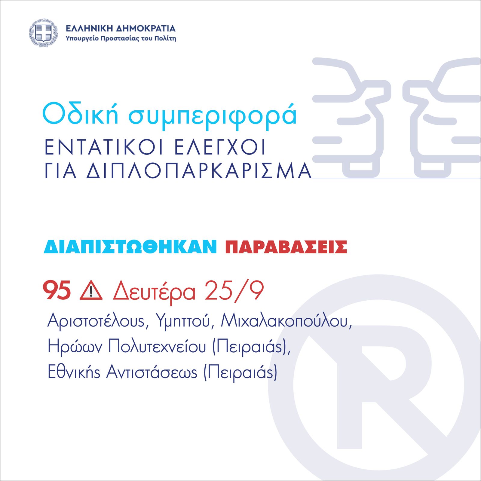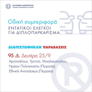 Τη Δευτέρα (25/09) – 95 παραβάσεις σε Αριστοτέλους, Υμηττού, Μιχαλακοπούλου και σε Ηρώων Πολυτεχνείου και Εθνικής Αντιστάσεως στον Πειραιά.