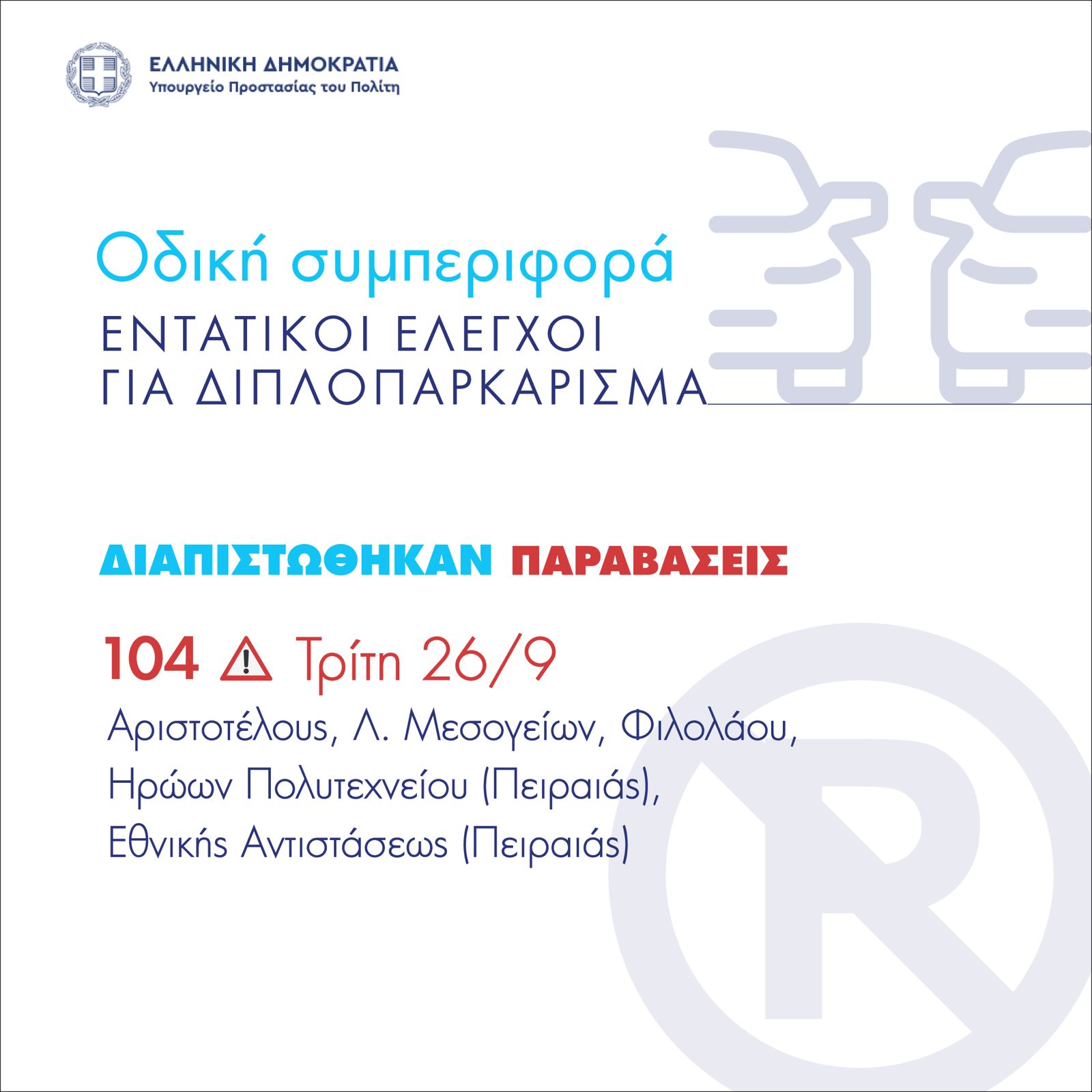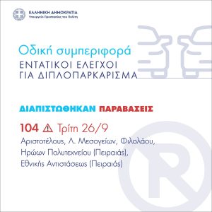 Την Τρίτη (26/09) – 104 παραβάσεις σε Αριστοτέλους, Μεσογείων, Φιλολάου και Ηρώων Πολυτεχνείου και Εθνικής Αντιστάσεως στον Πειραιά.