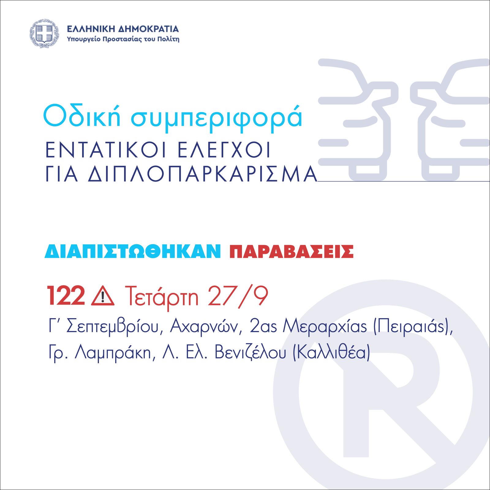 Την Τετάρτη (27/09) – 122 παραβάσεις σε Γ’ Σεπτεμβρίου, Αχαρνών, Ελ. Βενιζέλου Γρ. Λαμπράκη και 2ας Μεραρχίας στον Πειραιά.