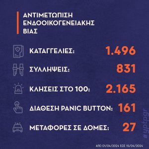 Συγκεκριμένα, το πρώτο 15νθήμερο Απριλίου 2024, για την αντιμετώπιση του φαινομένου της ενδοοικογενειακής βίας, δραστηριοποιήθηκαν οι υπηρεσίες της Ελληνικής Αστυνομίας, και ιδιαίτερα τα επιχειρησιακά Γραφεία Αντιμετώπισης Ενδοοικογενειακής Βίας, που επιλαμβάνονται στην πλειονότητα των περιστατικών.