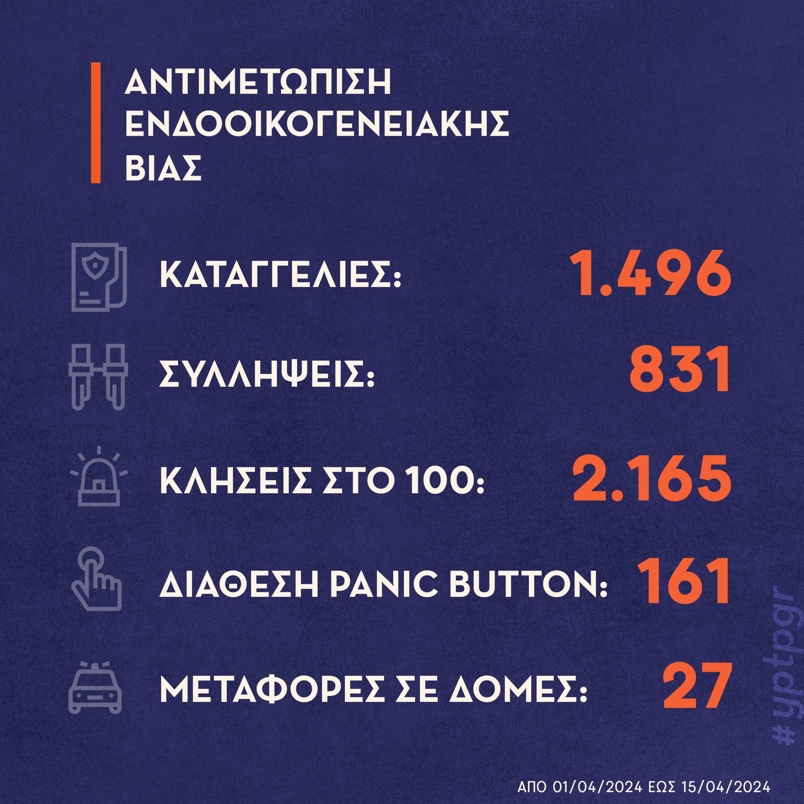 Στο πλαίσιο αυτό οι αστυνομικοί σε όλη τη χώρα ανταποκρίθηκαν σε 2.165 κλήσεις στο τηλεφωνικό κέντρο της Άμεσης Δράσης και χορηγήθηκε σε 161 γυναίκες θύματα η εφαρμογή του Panic Button. Συνολικά, διαχειρίστηκαν 1.496 περιστατικά, για τα οποία πραγματοποιήθηκαν 831 συλλήψεις, ενώ παράλληλα μεταφέρθηκαν σε δομές με οχήματα της Ελληνικής Αστυνομίας 27 θύματα.