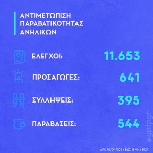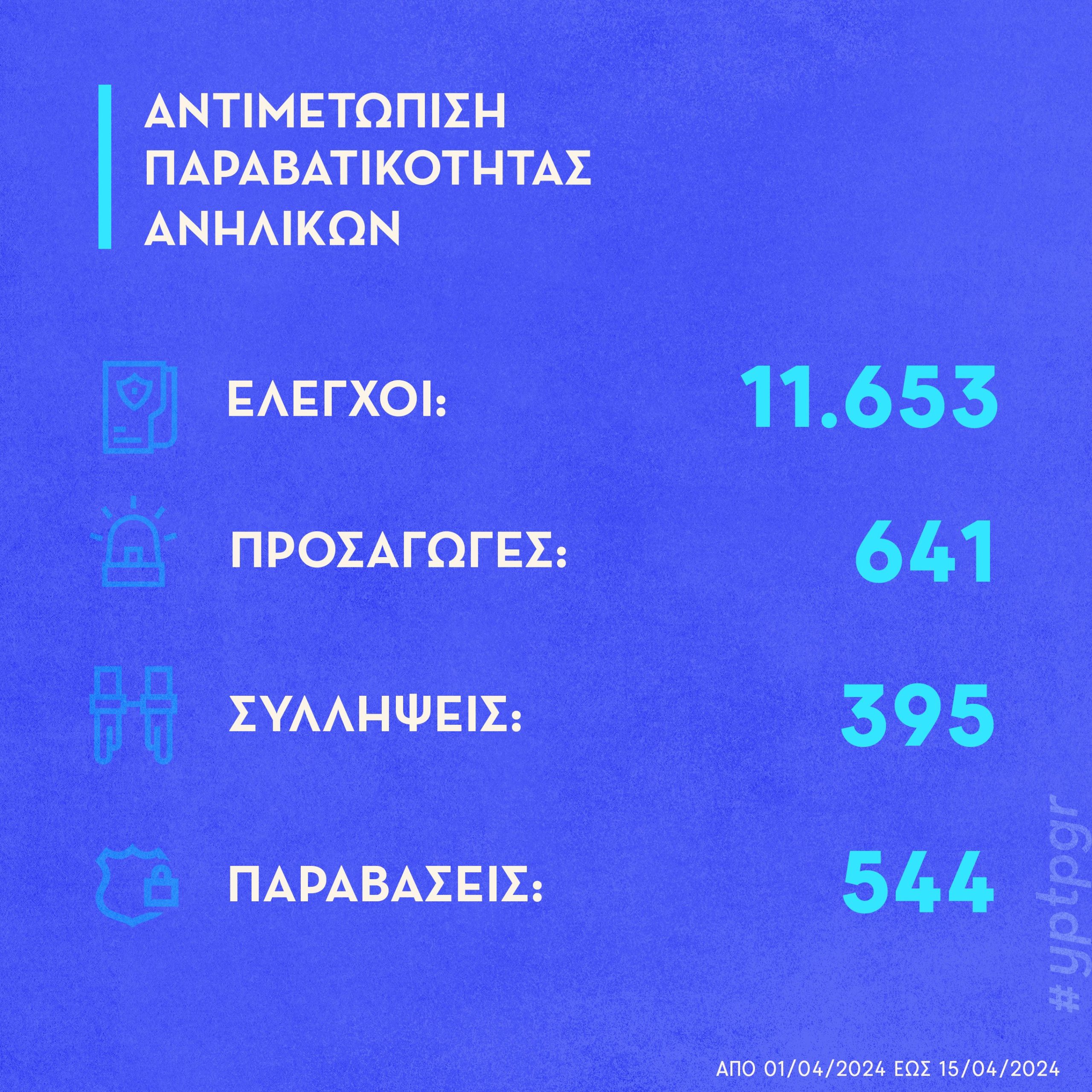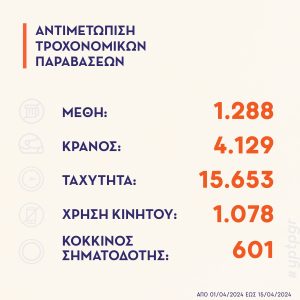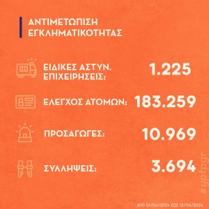 Αποτελέσματα του νέου σχεδίου της ΕΛ.ΑΣ. το πρώτο 15νθήμερο Απριλίου 2024 για την αντιμετώπιση της εγκληματικότητας, της ενδοοικογενειακής βίας, της παραβατικότητας ανηλίκων και τη βελτίωση της οδικής ασφάλειας