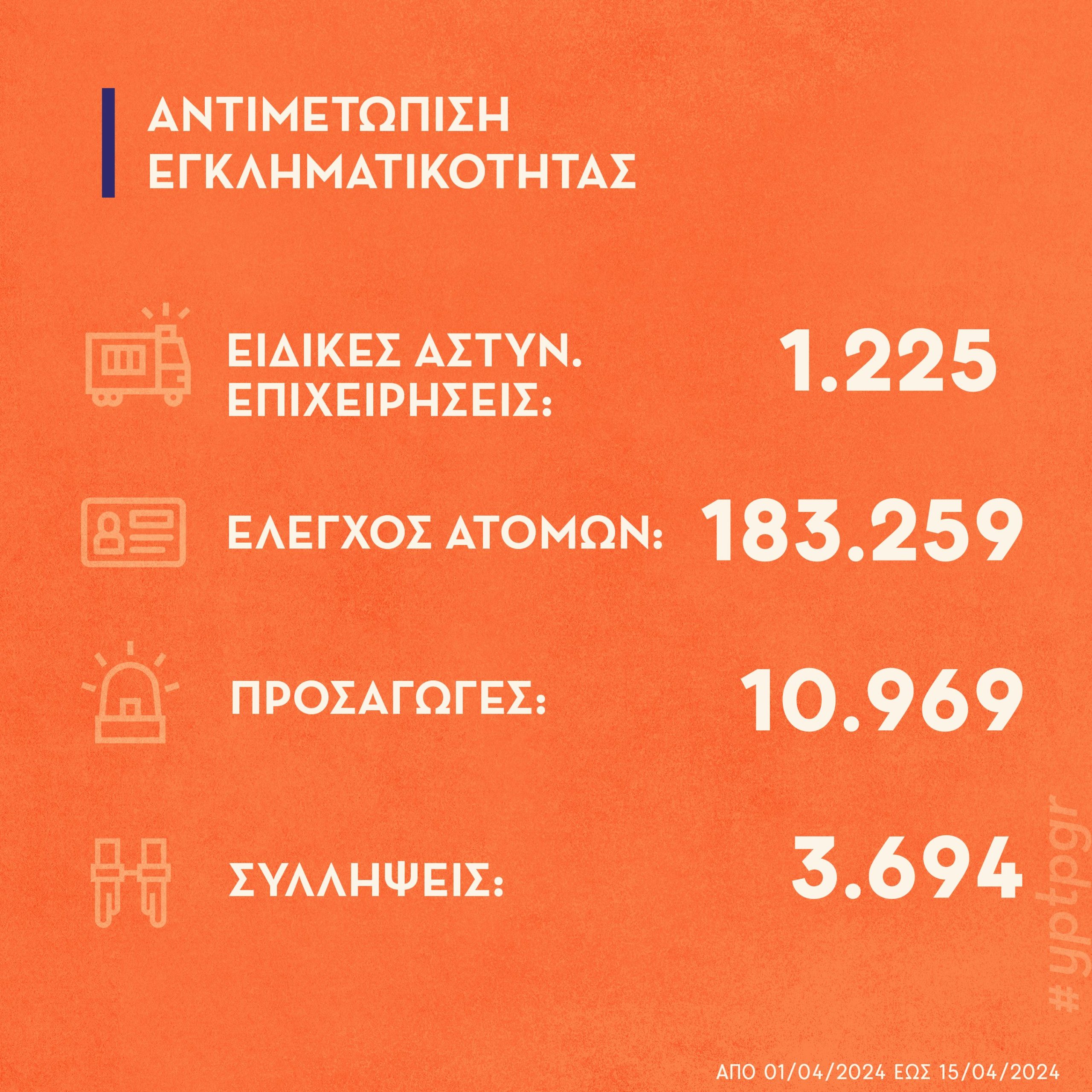 Πιο αναλυτικά, κατά τη διάρκεια των δράσεων για την καταπολέμηση της εγκληματικότητας σε ολόκληρη τη χώρα, από 1 έως 15 Απριλίου, πραγματοποιήθηκαν 1.225 ειδικές αστυνομικές επιχειρήσεις, κατά τις οποίες: