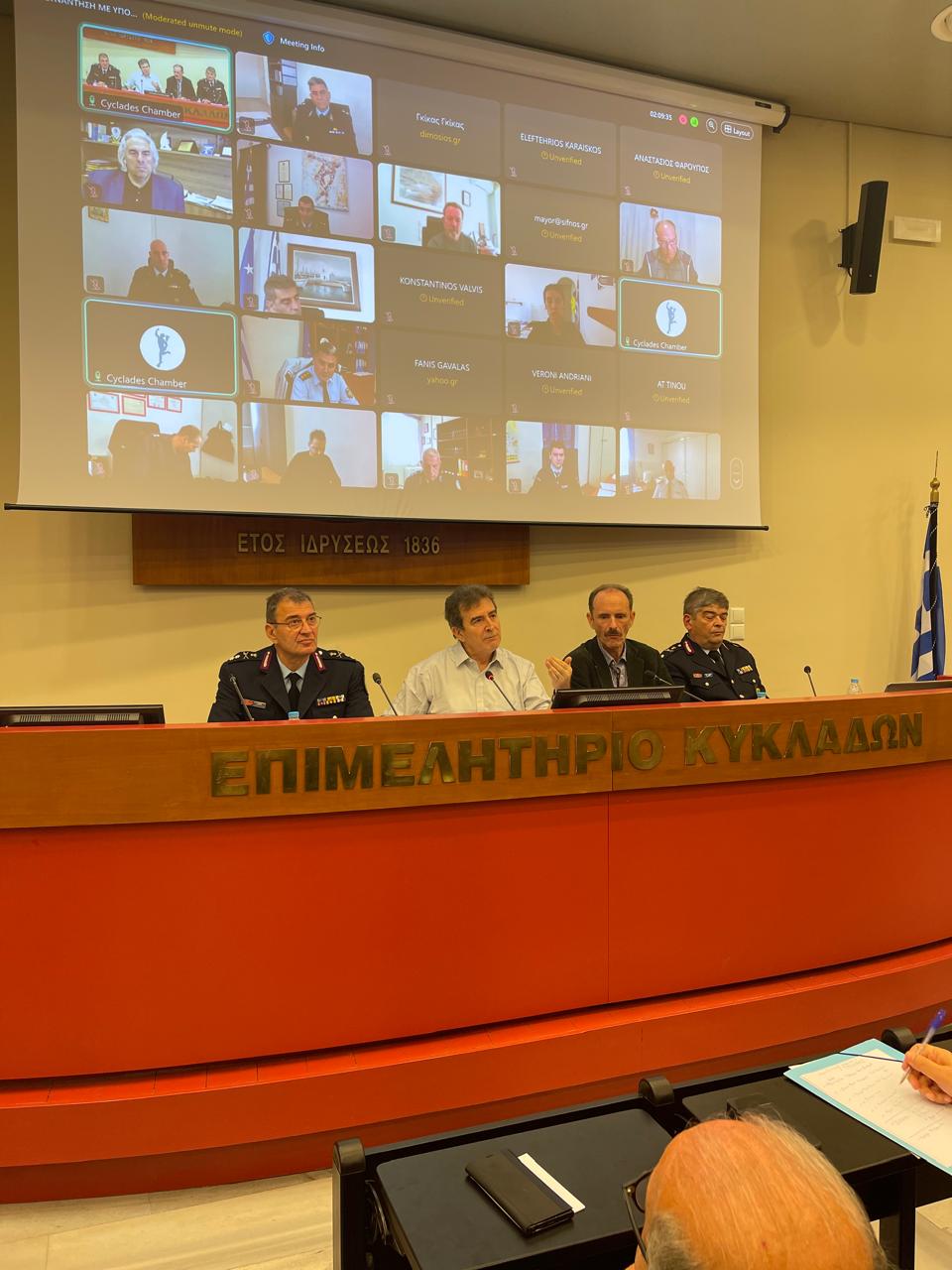 Στη σύσκεψη συμμετείχε ο Αντιπεριφερειάρχης Κυκλάδων, Γεώργιος Λεονταρίτης, οι Δήμαρχοι από τα νησιά των Κυκλάδων, τόσο με φυσική παρουσία, όσο και μέσω τηλεδιάσκεψης, καθώς και μέλη του Επιμελητηρίου Κυκλάδων.