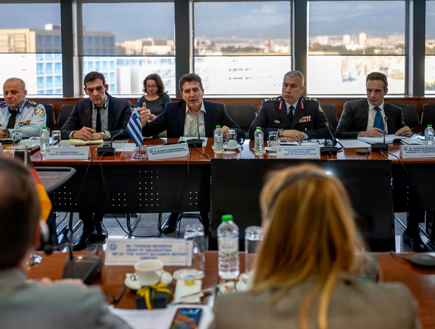 Στη συνάντηση παρέστησαν από ελληνικής πλευράς ο Γενικός Γραμματέας Δημόσιας Τάξης,  ο Διπλωματικός Σύμβουλος του Υπουργού Προστασίας του Πολίτη, πρέσβης Γεώργιος Πετμεζάκης, ο Αρχηγός της ΕΛ.ΑΣ, Αντιστράτηγος, Δημήτριος Μάλλιος, όπως και Ανώτεροι Αξιωματικοί της ΕΛ.ΑΣ. Τη γερμανική αντιπροσωπεία συνόδευε ο πρέσβης της Γερμανίας στην Ελλάδα, Αντρέας Κιντλ, όπως και άλλα στελέχη της γερμανικής πρεσβείας.