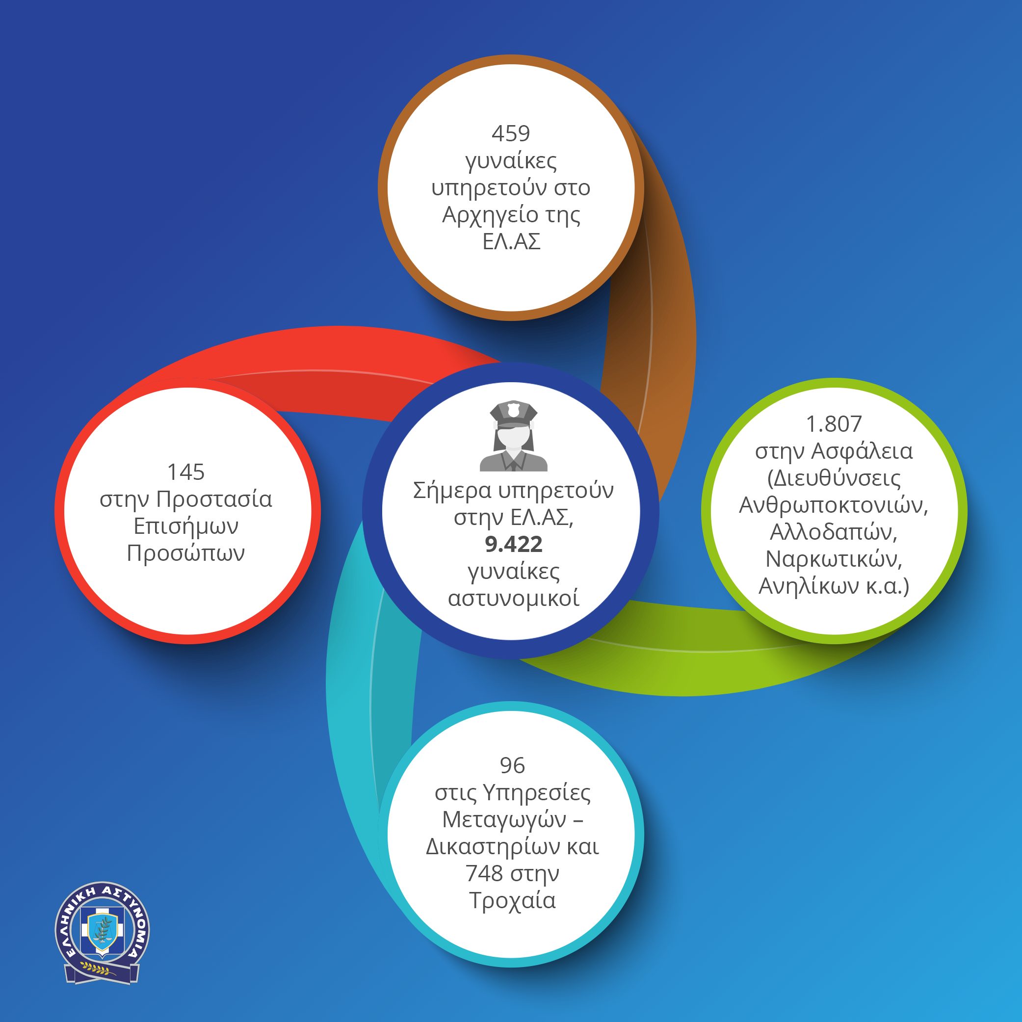 • Σήμερα υπηρετούν στην Ελληνική Αστυνομία 9.422 γυναίκες αστυνομικοί, 16% του συνόλου του προσωπικού του Σώματος. Από αυτές οι 2.372 είναι αξιωματικοί (δλδ. το 25% των γυναικών αστυνομικών, ενώ το αντίστοιχο ποσοστό για τους άνδρες είναι 16%).