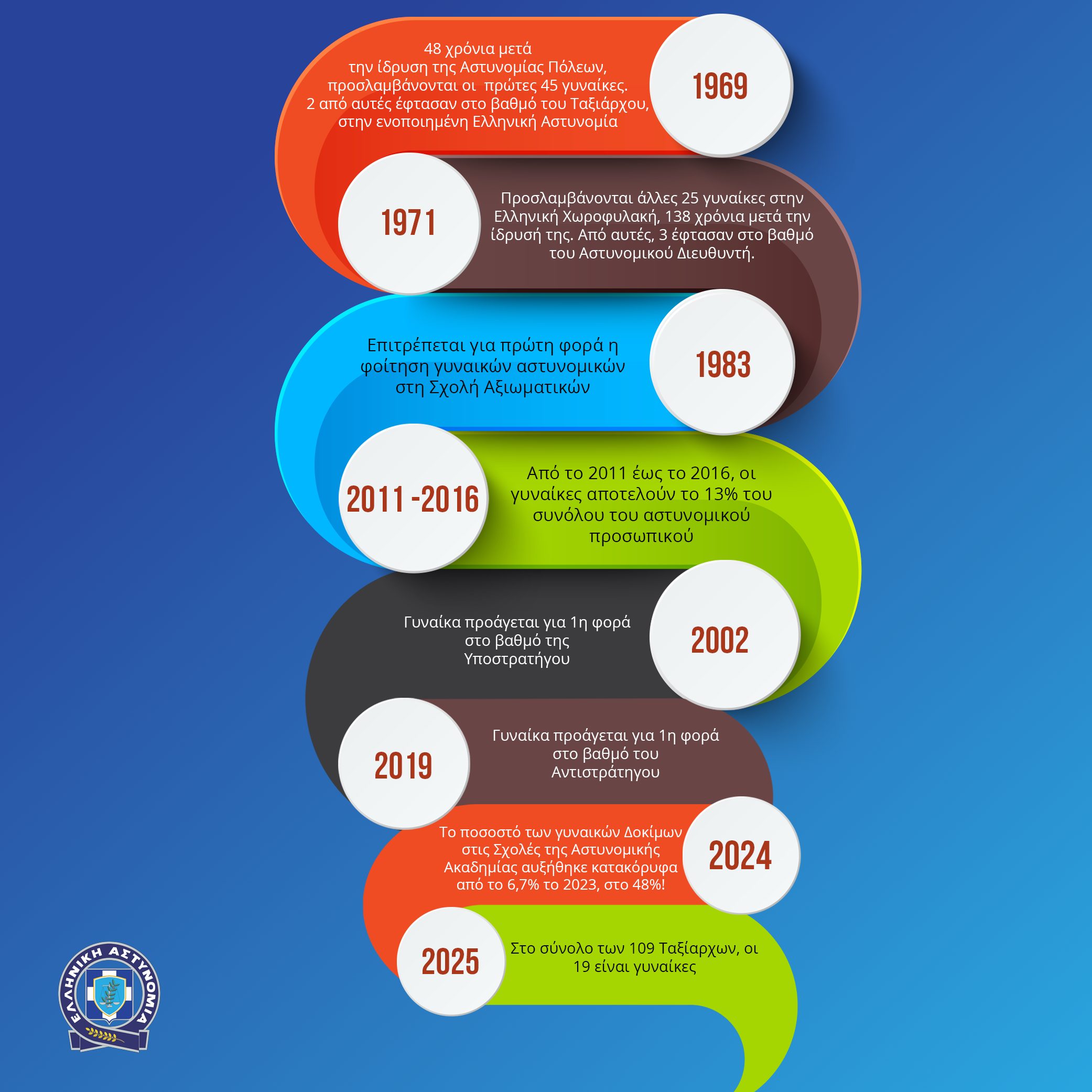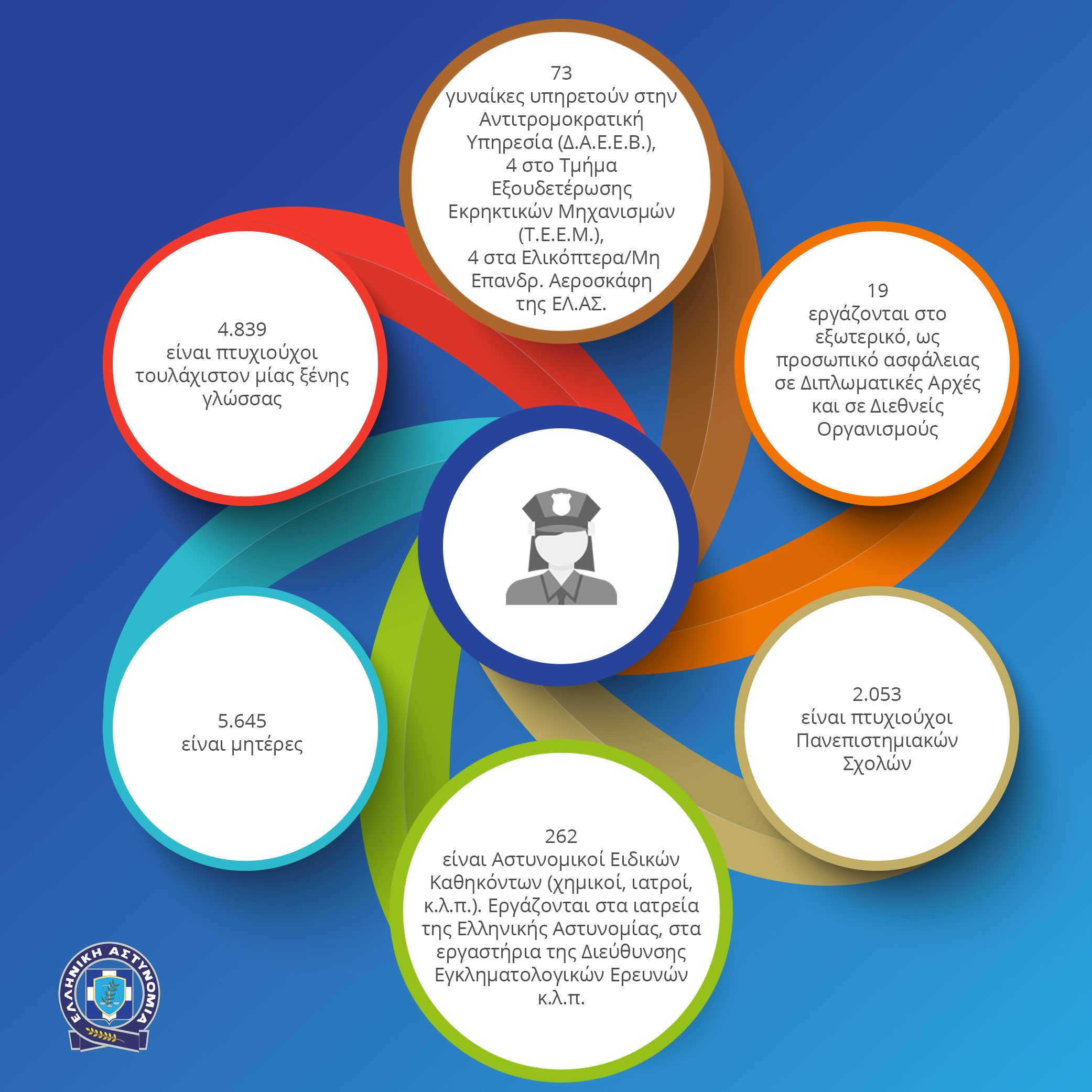 • Η Διευθύντρια του Επιτελικού Γραφείου του Αρχηγού της Ελληνικής Αστυνομίας είναι- για πρώτη φορά- γυναίκα, η Εκπρόσωπος της Ελληνικής Αστυνομίας είναι γυναίκα, 80  γυναίκες αξιωματικοί είναι Διοικητές Αστυνομικών Υπηρεσιών, 73υπηρετούν στην Αντιτρομοκρατική Υπηρεσία (Δ.Α.Ε.Ε.Β.), 4 στο Τμήμα Εξουδετέρωσης Εκρηκτικών Μηχανισμών (Τ.Ε.Ε.Μ.) και 4 στα Ελικόπτερα/Μη Επανδρωμένα Αεροσκάφη της Ελληνικής Αστυνομίας.