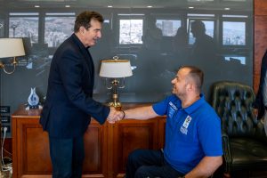«Είμαστε δίπλα σας, συμπαραστάτες και θα συνεχίσουμε αυτή την προσπάθεια», τόνισε ο Υπουργός Προστασίας του Πολίτη, Μιχάλης Χρυσοχοΐδης απευθυνόμενος στον Πρόεδρο της Ομοσπονδίας Σωματείων Ελλήνων Καλαθοσφαιριστών με Αμαξίδιο, Χρήστο Καλούδη.