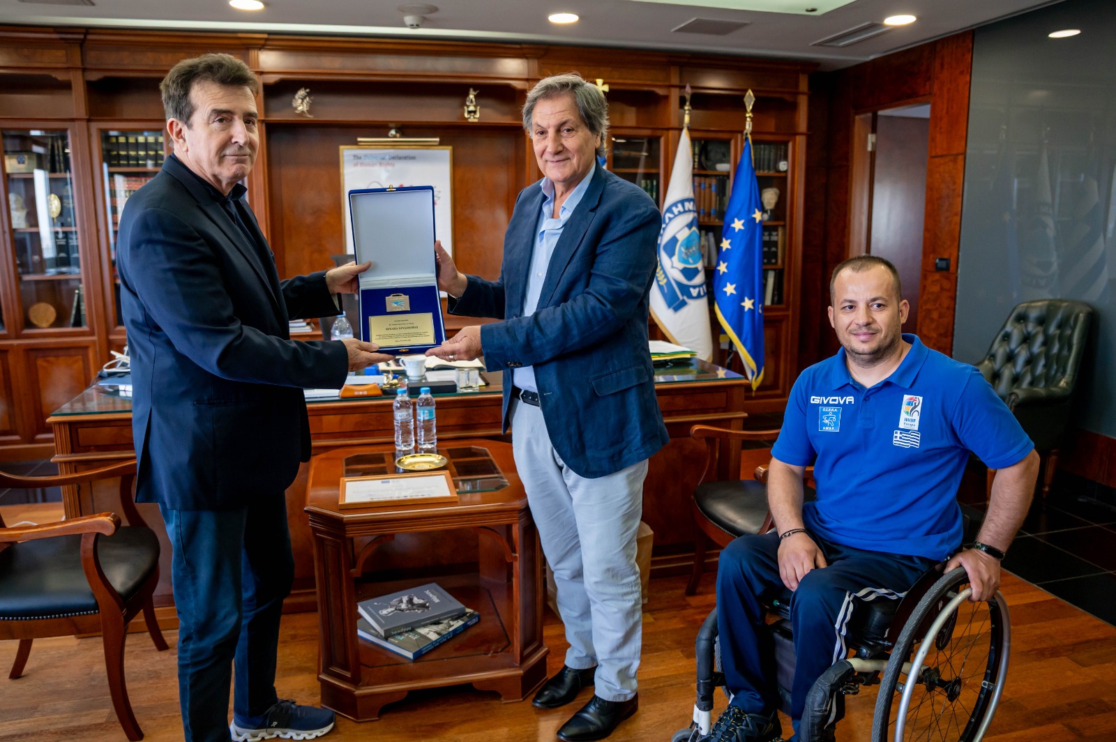 Ο κ. Καλούδης, εκπροσωπώντας το Διοικητικό Συμβούλιο της ΟΣΕΚΑ, μαζί με τον καλαθοσφαιριστή του Α.Σ. ΑΤΛΑΣ και της Εθνικής Ομάδας μπάσκετ με Αμαξίδιο, Αρμάντ Μίνα επισκέφθηκαν τον κ. Υπουργό, προκειμένου να τον ανακηρύξουν σε «Πρεσβευτή Καλής Θέλησης για την καλαθοσφαίριση με αμαξίδιο», τη μέγιστη τιμή της Ομοσπονδίας σε άτομα με σπουδαία προσφορά.