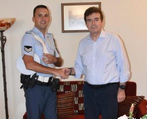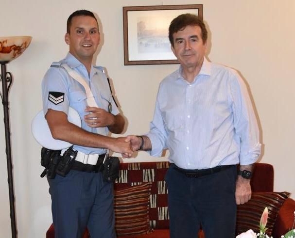 Τέλος, ο κ. Υπουργός συνάντησε τον Υπαρχιφύλακα Γεώργιο Μπρίτσο που υπηρετεί στο Τμήμα Τροχαίας Αλεξανδρούπολης και ενώ ήταν εκτός υπηρεσίας, έσωσε οδηγό ταξί που έπεσε στο νερό. Του έδωσε συγχαρητήρια για τη γενναία του πράξη για την αυτοθυσία και την αυταπάρνηση που έδειξε μπροστά στο καθήκον.